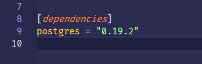 創(chuàng)建好項(xiàng)目后,在 cargo.toml 里添加 postgres 的依賴: