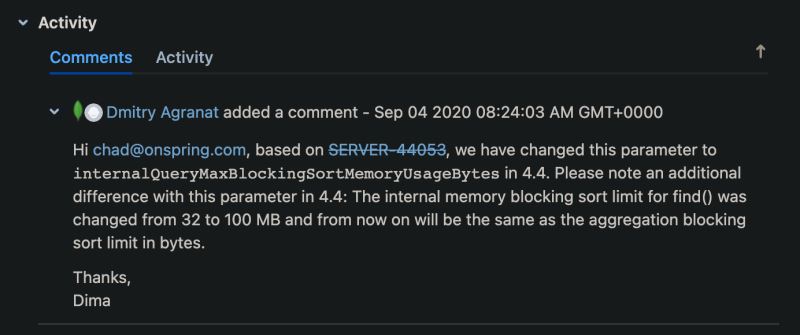 第二個JIRA [SERVER-50767] internalQueryExecMaxBlockingSortBytes causing config exception on mongod load - Mongo中,Comments里提到了,新的internalQueryMaxBlockingSortMemoryUsageBytes參數(shù),默認(rèn)值從32MB改成了100MB。也許我的這個表使用100MB內(nèi)存進(jìn)行排序就夠用了,所以沒有報錯。