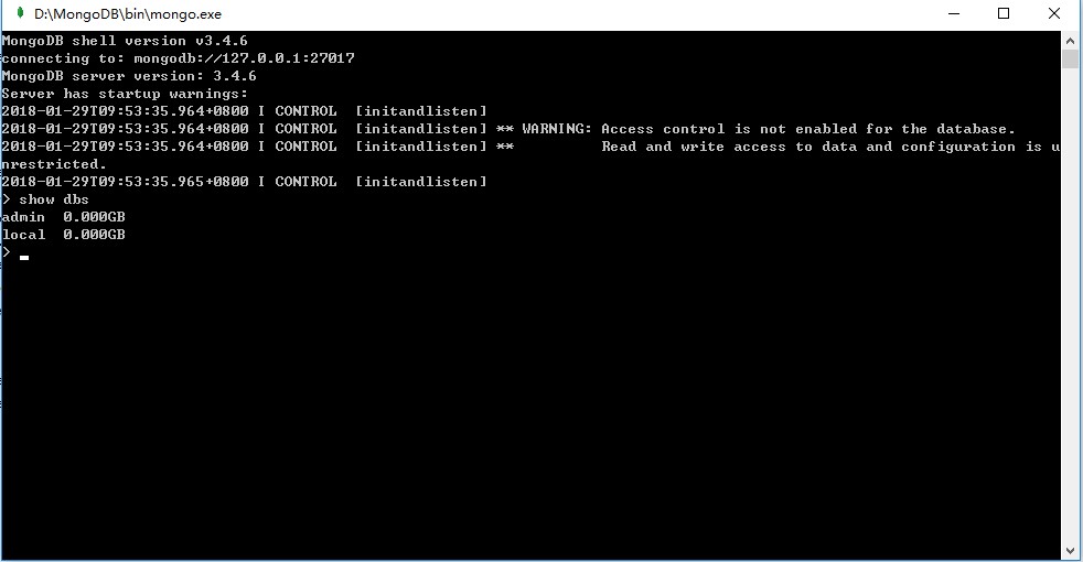 在連接MongoDB前確保啟動(dòng)MongoDB服務(wù),只需要在MongoDB安裝目錄的bin目錄下執(zhí)行mongo.exe即可。