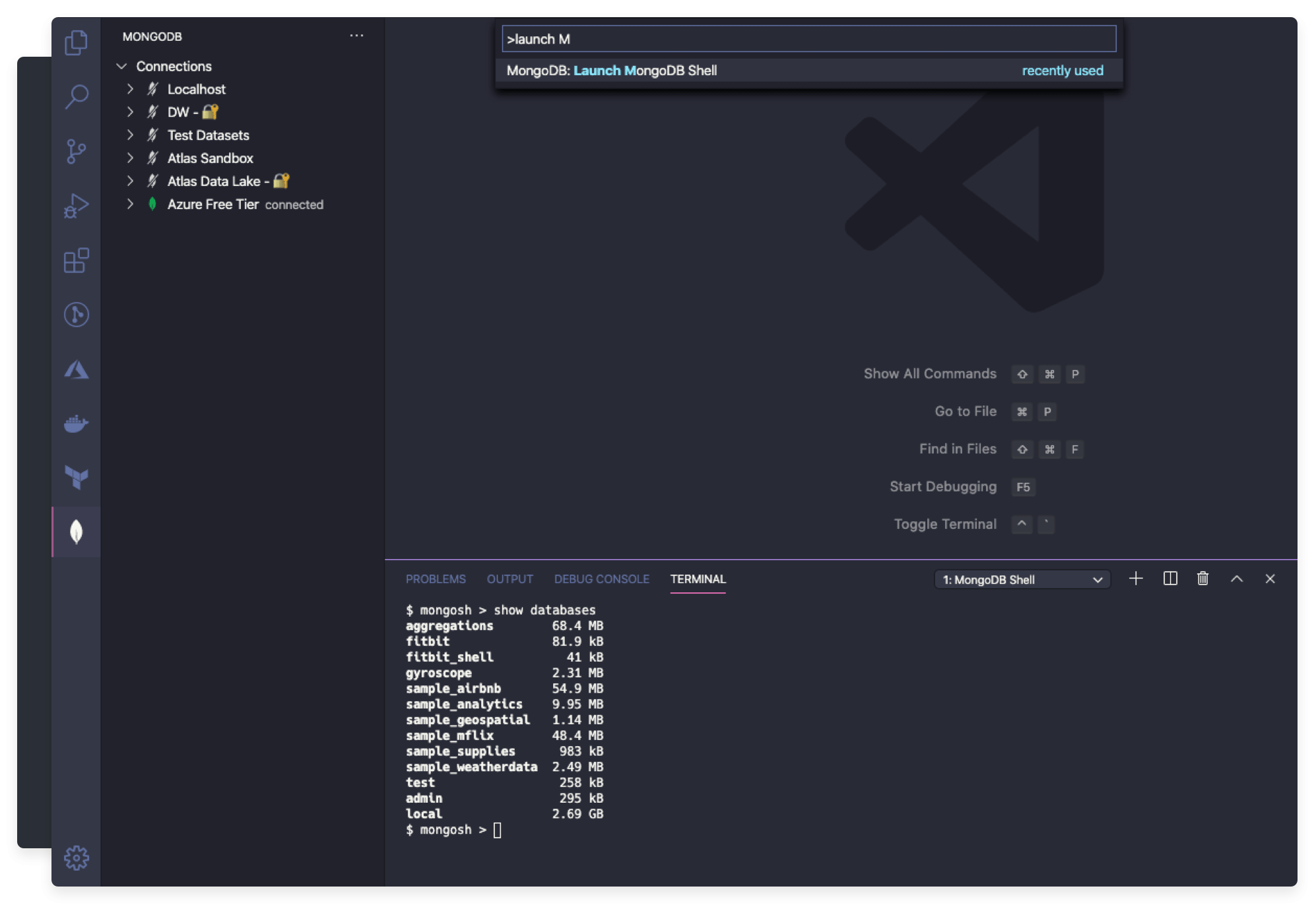 從命令面板啟動MongoDB Shell,以快速連接到VS Code中處于活動狀態(tài)的同一集群。