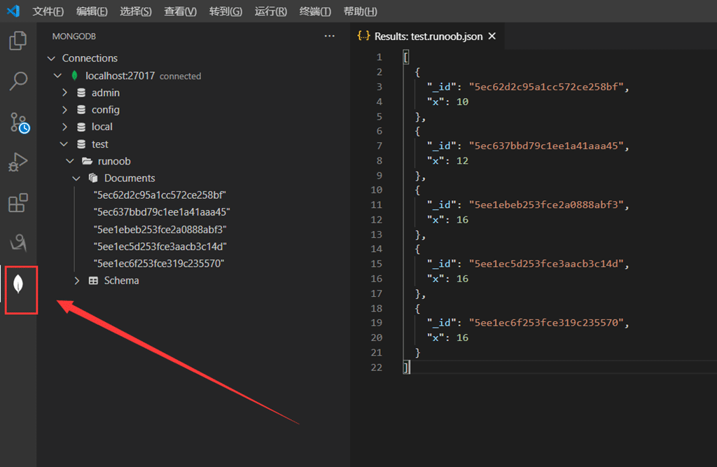 第一個命令將數(shù)字 10 插入到 runoob 集合的 x 字段中。