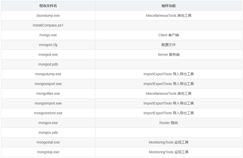 mongo.exe為客戶端程序;mongod.exe為服務(wù)端程序;其他程序及文件功能如下列表