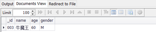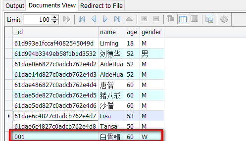 db.students.insert({_id:"001",name:"白骨精",age:60,gender:"W"})