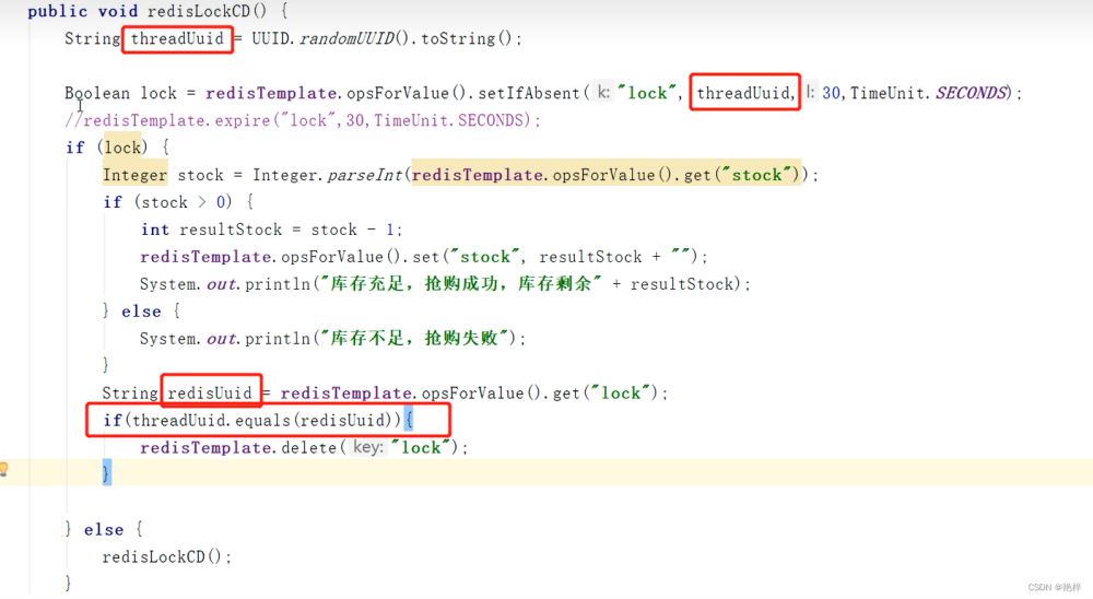 ①給當(dāng)前線程綁定一個局部變量uuid,由于每個線程都有一份自己的局部變量,那么線程和局部變量綁定之后,我們在刪除鎖之前判斷一下,當(dāng)前這把鎖是不是自己的載進(jìn)行刪除