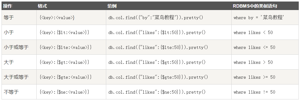 }以上實例中類似于 WHERE 語句:WHERE by='菜鳥教程' AND title='MongoDB 教程'