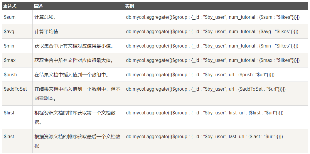 下表展示了一些聚合的表達式: