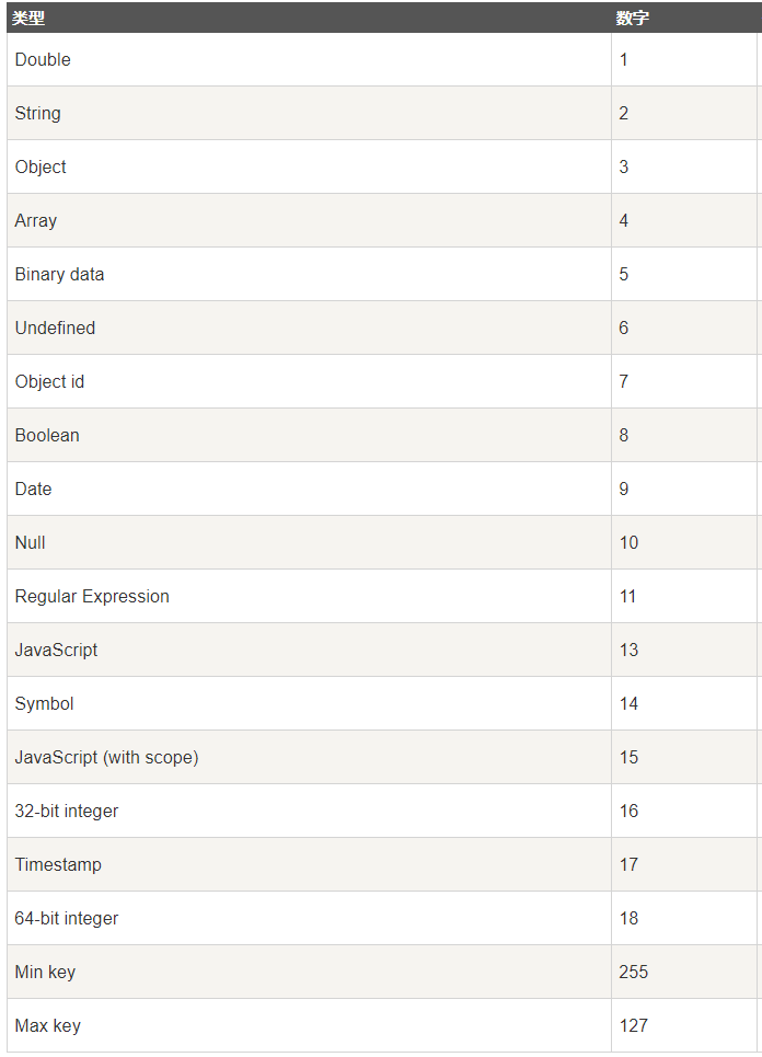 MongoDB 中可以使用的類型如下表所示: