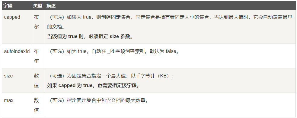 > db.createCollection("mycol", { capped : true, autoIndexId : true, size :