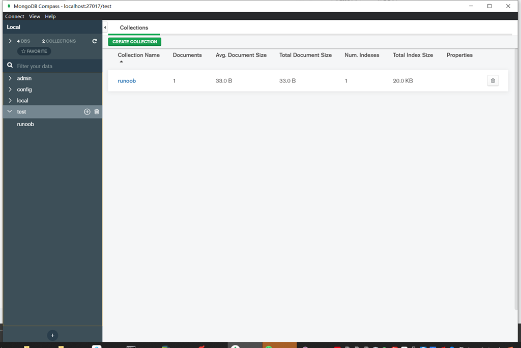 下面點擊左側(cè)test數(shù)據(jù)庫看到如下集合情況,可以點擊綠色按鈕直接創(chuàng)建集合