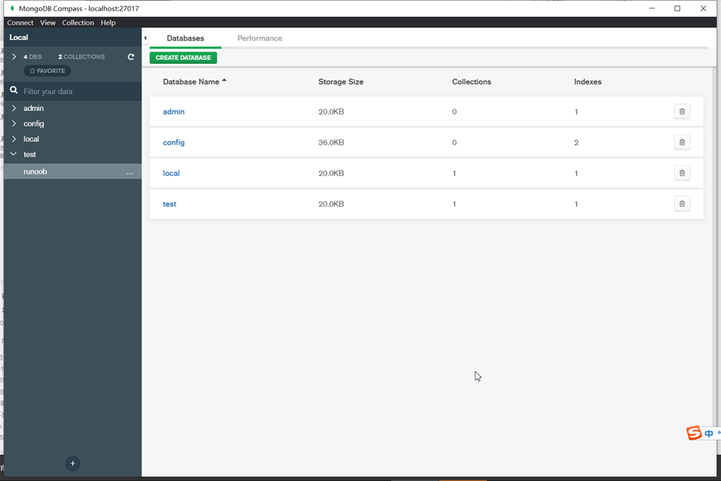 左側(cè)顯示數(shù)據(jù)庫列表 右側(cè)是數(shù)據(jù)庫的存儲大小、集合數(shù)量以及索引數(shù)量