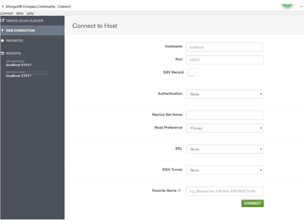 連接MongoDB Compass比較簡單,可以選擇默認(rèn)的服務(wù)器、接口和None認(rèn)證,然后點擊CONNECT即可: