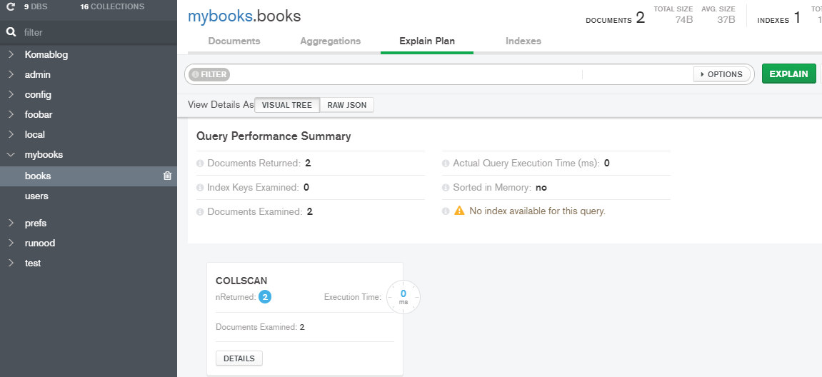 在MongoDB shell中有explain()函數(shù),用于檢測診察數(shù)據(jù)的運行情況, Explain Plan也具有相同的功能,評估查詢的性能,
