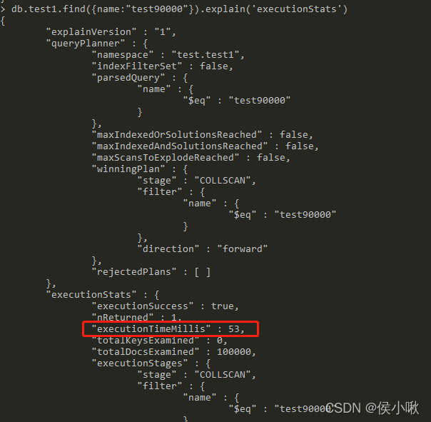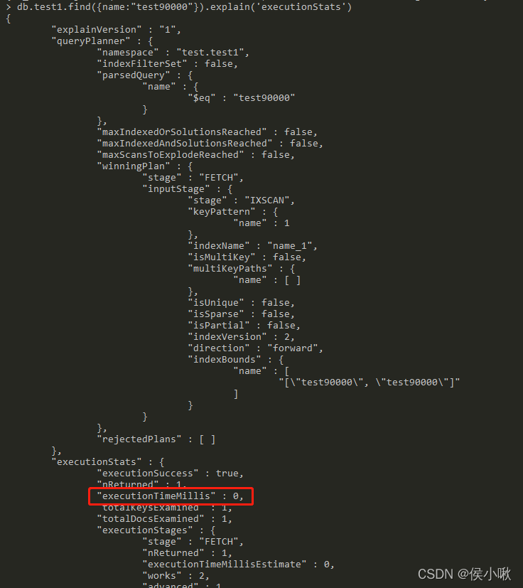 db.test1.find({name:"test90000"}).explain('executionStats')