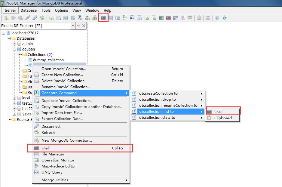 如果想用命令行寫代碼,可以在以下幾處地方進(jìn)入shell,從不同的位置進(jìn)去,默認(rèn)連接的范圍也不一樣,可以是服務(wù)器級別,也可以是db級別,也可以是表級別,示例就是從表進(jìn)入的shell 。