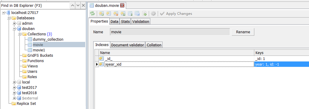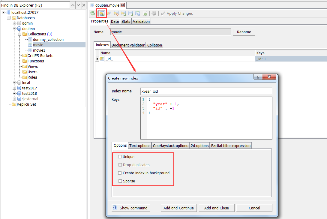 db.movie.ensureIndex({"year":1,"id":-1},{background: true})② 也可以直接通過GUI來實現(xiàn)。