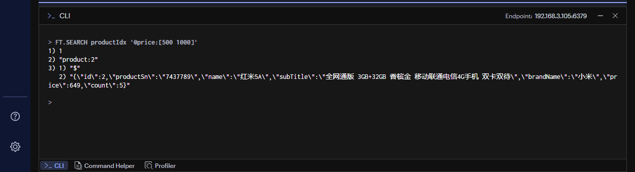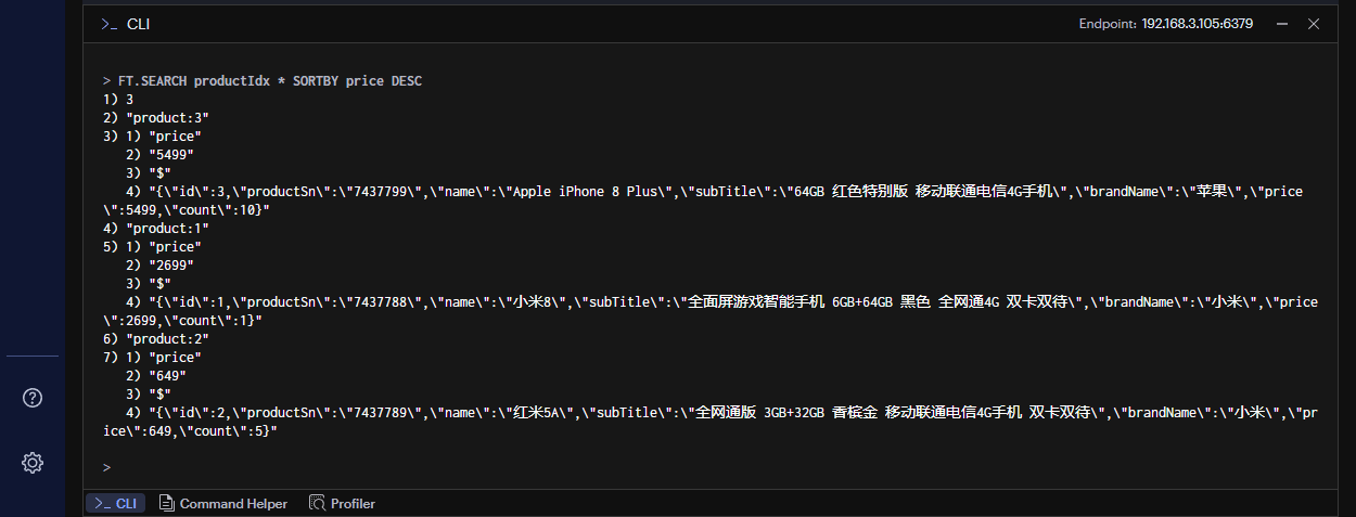 由于我們設(shè)置了price字段為SORTABLE,我們可以以price降序返回商品信息;