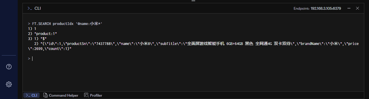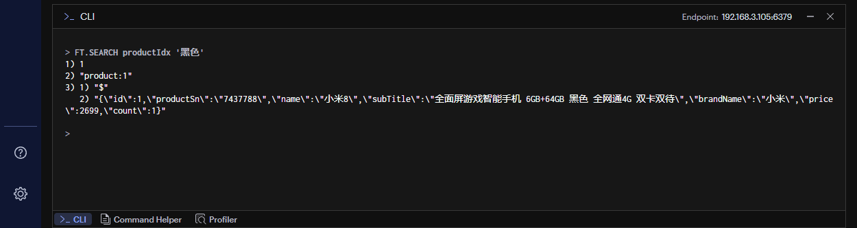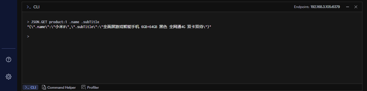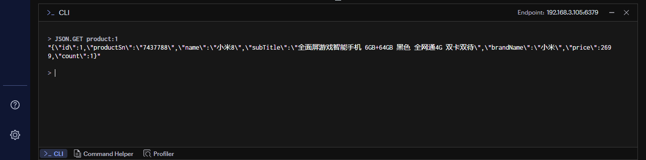 JSON.SET product:1 $ '{"id":1,"productSn":"7437788","name":"小米8","subTitle":"全面屏游戲智能手機 6GB+64GB 黑色 全網(wǎng)通4G 雙卡雙待","brandName":"小米","price":2699,"cou
