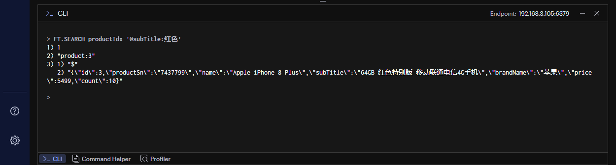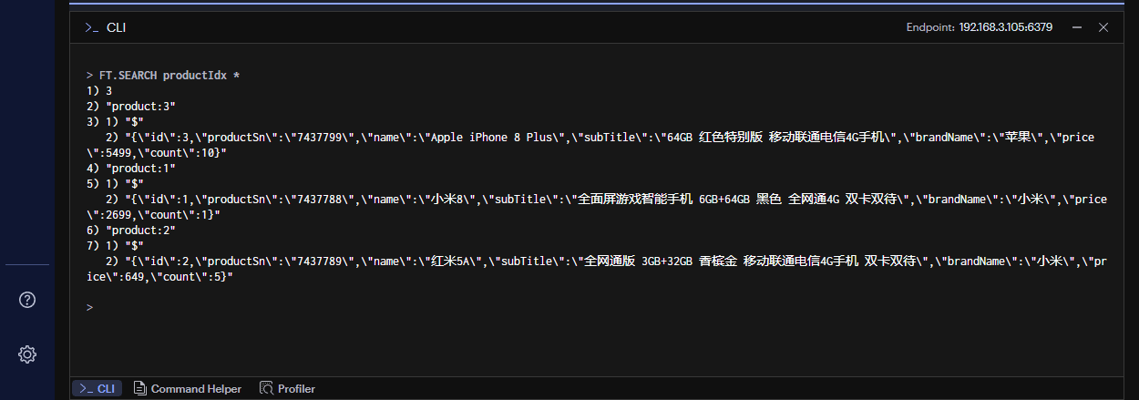 建立完索引后,我們就可以使用FT.SEARCH對數(shù)據(jù)進行查看了,比如使用*可以查詢?nèi)浚?/p>