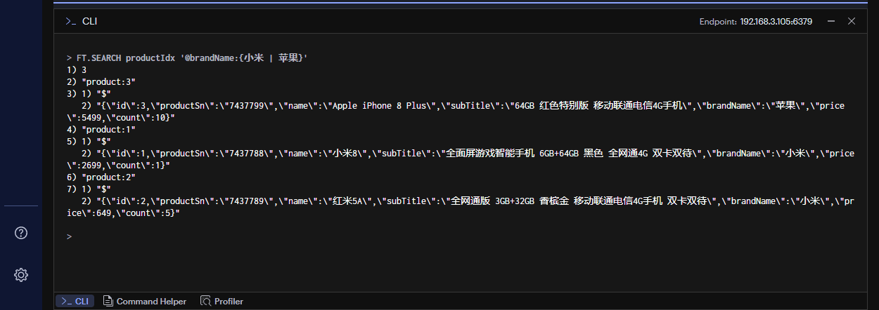 FT.SEARCH productIdx '@brandName:{小米 | 蘋果}'