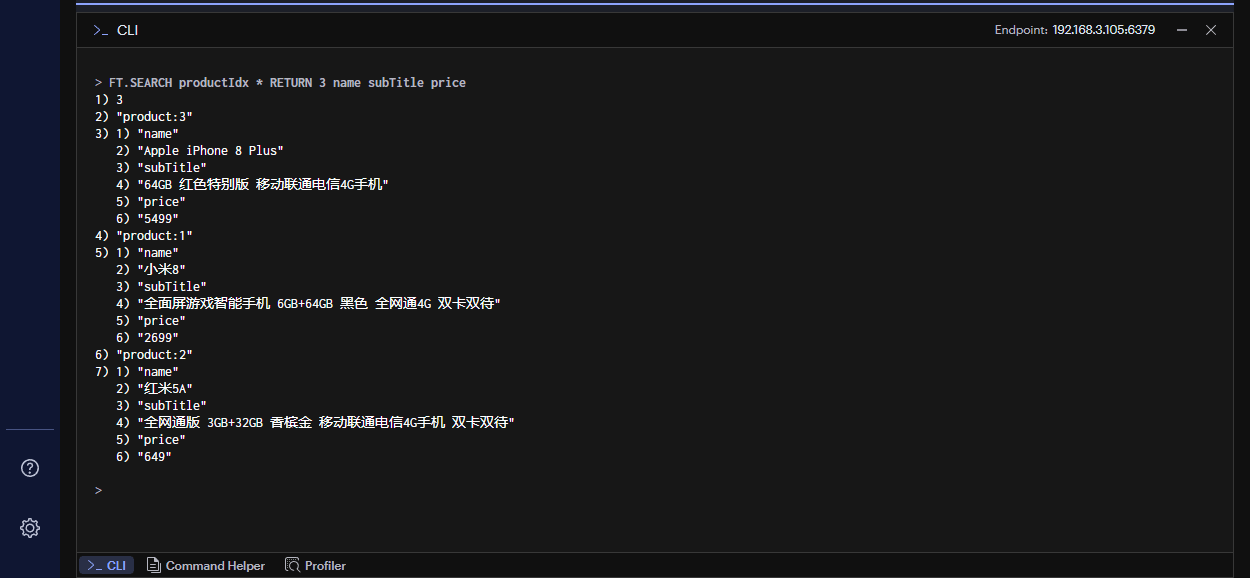 FT.SEARCH productIdx * RETURN 3 name subTitle price