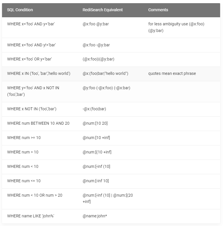 RediSearch的搜索語法比較復(fù)雜,不過我們可以對比SQL來使用它,具體可以參考下表。