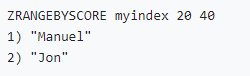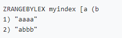 ZRANGEBYLEX myindex "[banana:" + LIMIT 0 10 1) "banana:123" 2) "banaooo:1" 3) "banned user:49" 4) "banning:89"
