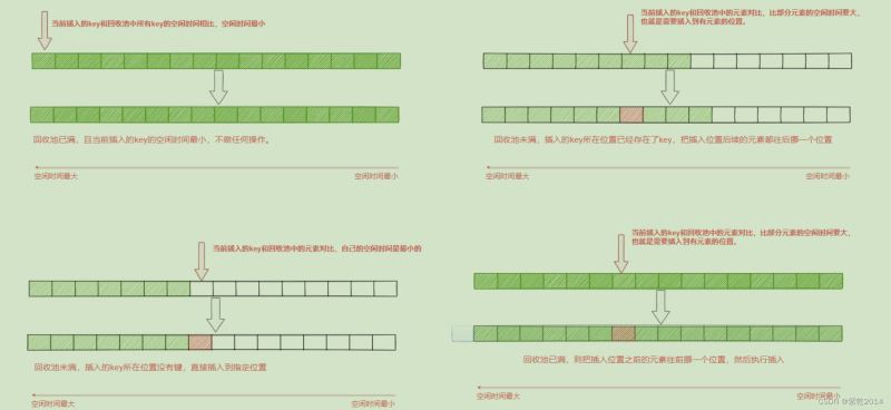 - 回收池滿了,并且當(dāng)前插入的key的空閑時(shí)間最?。ㄒ簿褪腔厥粘刂械乃衚ey都比當(dāng)前插入的key的空閑時(shí)間都要大),則不作任何操作。