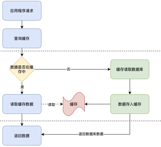 在上述流程圖中,重點(diǎn)關(guān)注一下虛線框內(nèi)的操作,這部分操作不再由應(yīng)用程序來處理,而是由緩存自己來處理。也就是說,當(dāng)應(yīng)用從緩存中查詢某條數(shù)據(jù)時,如果數(shù)據(jù)不存在則由緩存來完成數(shù)據(jù)的加載,最后再由緩存返回?cái)?shù)據(jù)結(jié)果給應(yīng)用程序。