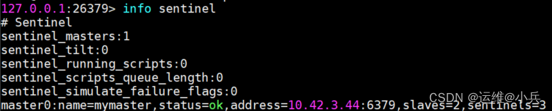 127.0.0.1:6379> exit root@redis-0:/data# redis-cli -p 26379 127.0.0.1:26379> info sentinel #查看哨兵信息