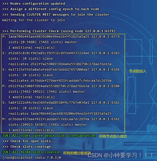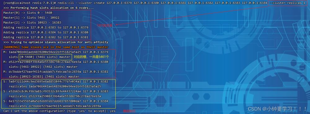 # --cluster create 創(chuàng)建集群 # --cluster-replicas 1 指定集群的內部結構(1代表一個master連接1個slave,2代表一個master連接兩個save) # 后面的連接端口按數(shù)量實現(xiàn)master連接哪一個slave,1對1,1對2 redis-cli --cluster create 127.0.0.1:6379 127.0.0.1:6380 127.0.0.1:6381 127.0.0.1:6382 127.0.0.1:6383 127.0.0.1:6384 --cluster-replicas 1