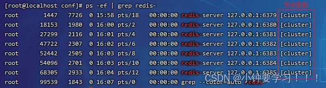 [root@localhost conf]# sed "s/6379/6380/g" redis-6379.conf > redis-6380.conf [root@localhost conf]# sed "s/6379/6381/g" redis-6379.conf > redis-6381.conf [root@localhost conf]# sed "s/6379/6382/g" redis-6379.conf > redis-6382.conf [root@localhost conf]# sed "s/6379/6383/g" redis-6379.conf > redis-6383.conf [root@localhost conf]# sed "s/6379/6384/g" redis-6379.conf > redis-6384.conf [root@localhost conf]# sed "s/6379/6385/g" redis-6379.conf > redis-6385.conf