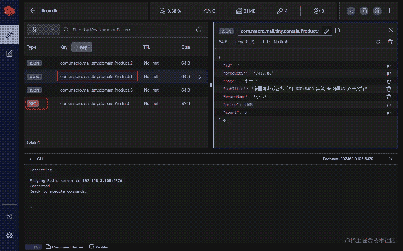 - 導(dǎo)入成功后我們可以發(fā)現(xiàn)RedisOM已經(jīng)向Redis中插入了原生JSON數(shù)據(jù),以全類名:ID的形式命名了鍵,同時(shí)將全部的ID存儲到了一個(gè)SET集合中去了;