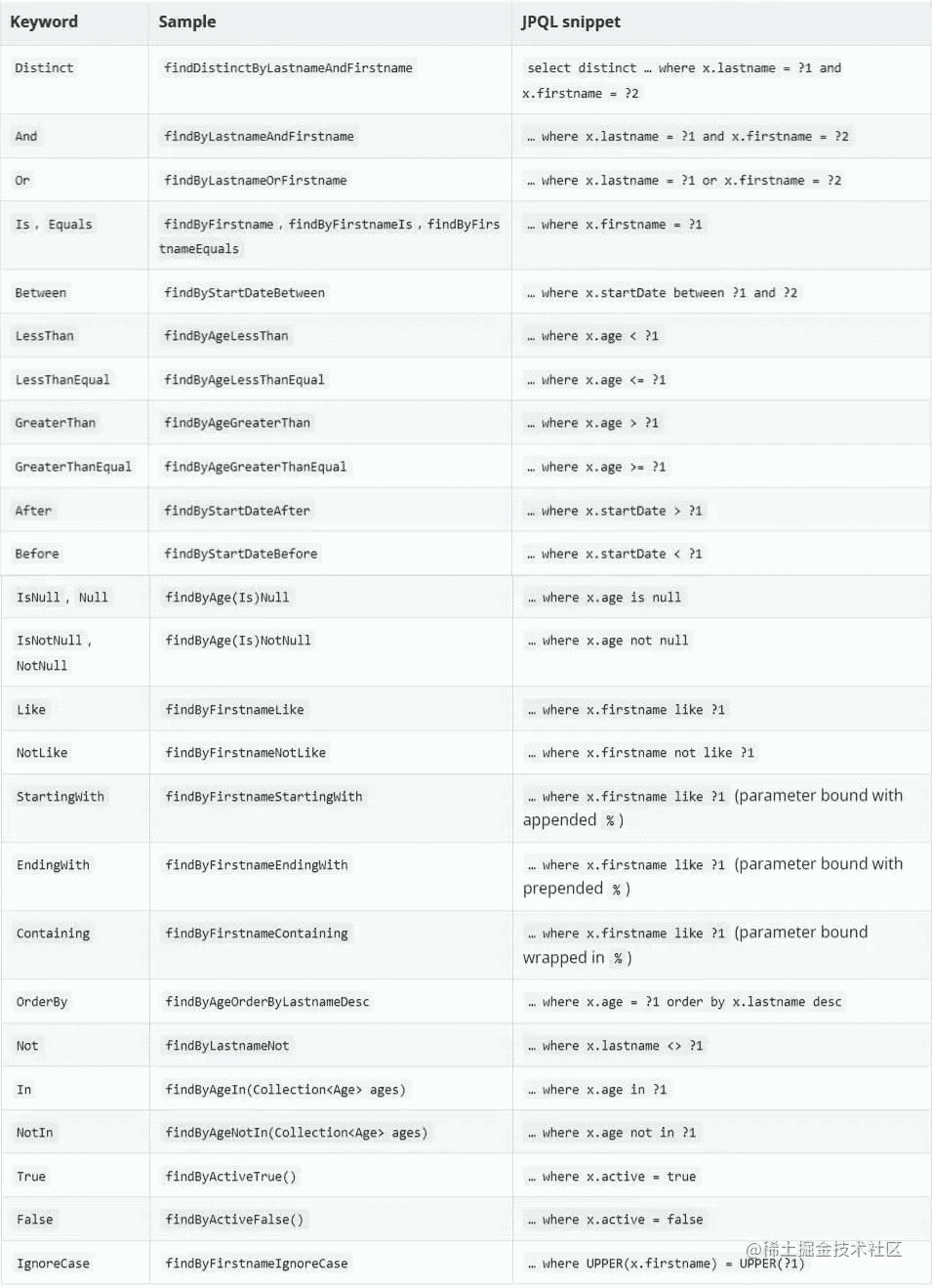 - 這類根據(jù)方法名稱自動(dòng)實(shí)現(xiàn)查詢邏輯的衍生查詢有什么規(guī)則呢,具體可以參考下表。