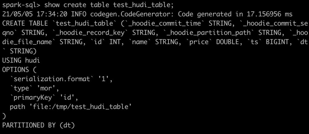 create table test_hudi_table ( id int, name string, price double, ts long, dt string ) using hudi partitioned by (dt) options ( primaryKey = 'id', type = 'mor' ) location 'file:///tmp/test_hudi_table'