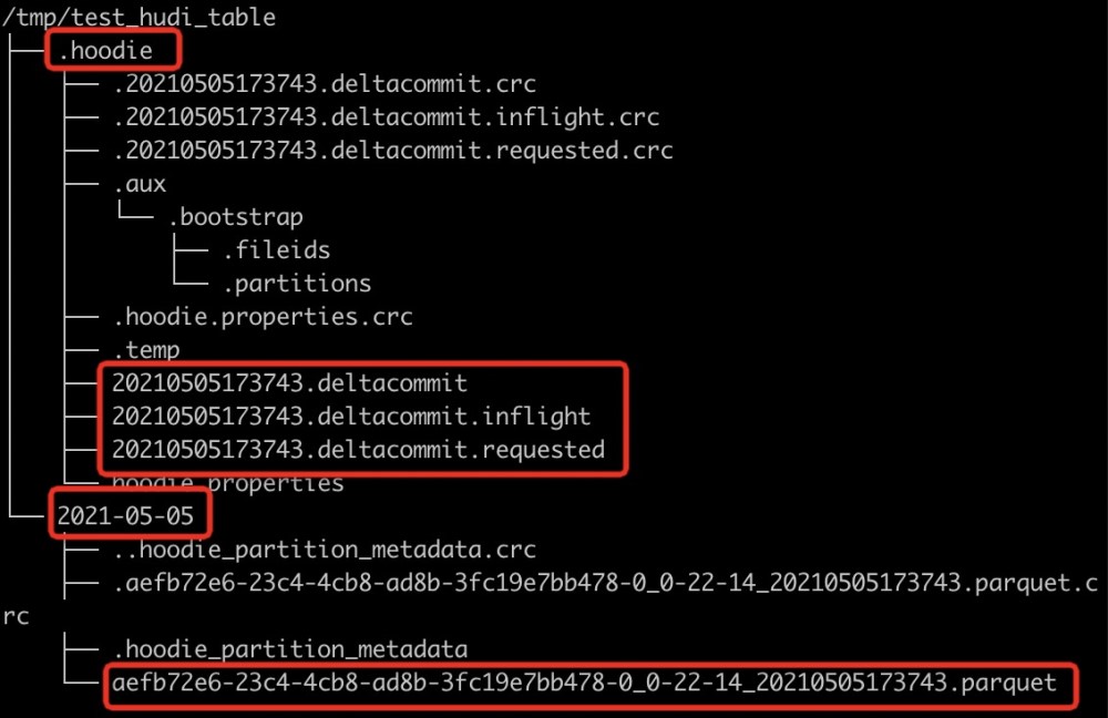 insert完成后查看Hudi表本地目錄結(jié)構(gòu),生成的元數(shù)據(jù)、分區(qū)和數(shù)據(jù)與Spark Datasource寫(xiě)入均相同。