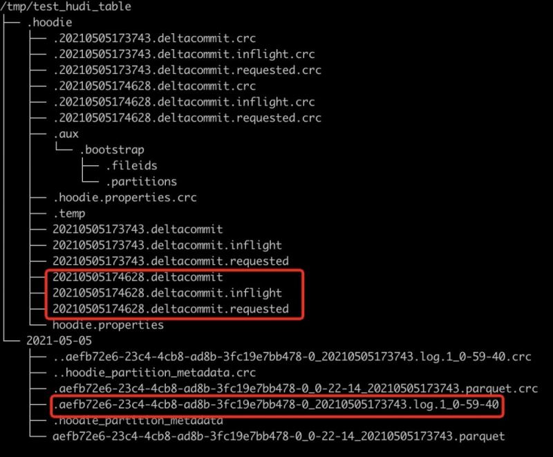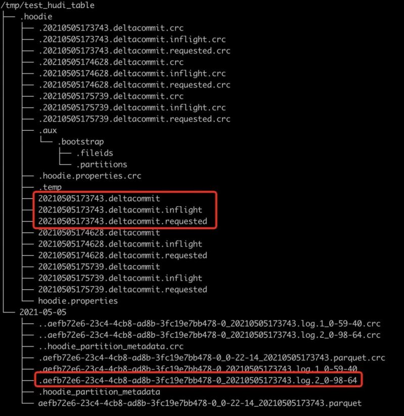 查看Hudi表的本地目錄結(jié)構(gòu)如下,可以看到delete之后又生成了一個(gè)deltacommit,同時(shí)生成了一個(gè)增量log文件。