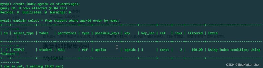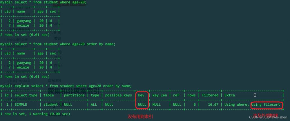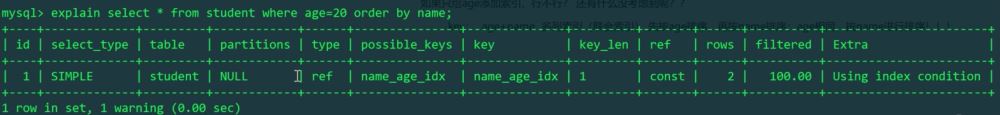 可以看到,age命中索引了,查詢age所在的索引樹。由于我們寫的是select *,依然存在回表。還有using filesort,因?yàn)槭褂胊ge=20查詢到的結(jié)果是多個(gè),然而name此時(shí)是沒有順序的,所以還需要再進(jìn)行外部排序。