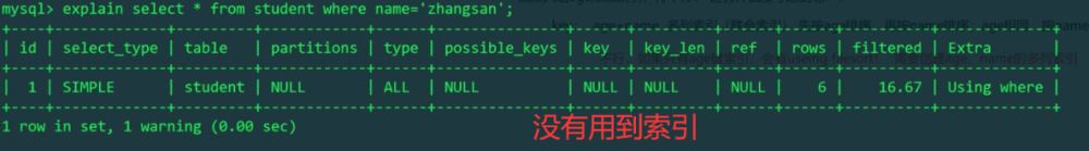 我們看到這里沒有用到索引,因?yàn)槲覀冇?age,name)創(chuàng)建索引,是先按age排序,再按name排序。如果我們只用name作為過濾條件,這就沒有辦法使用索引匹配了,因?yàn)槭莾?yōu)先用age排序。