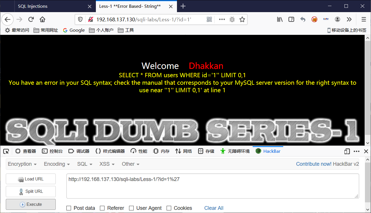id為1',數(shù)據(jù)庫報錯,由報錯信息猜測閉合方式為單引號