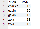 假設(shè)有一個(gè)表“CESHIDEMO”,包含兩個(gè)字段,分別 NAME 和 AGE,具體格式如下: