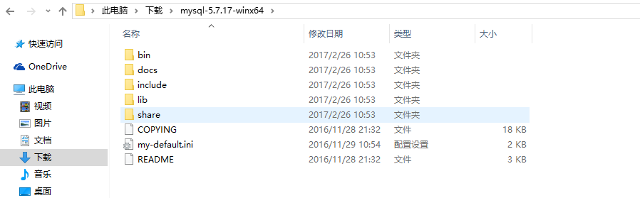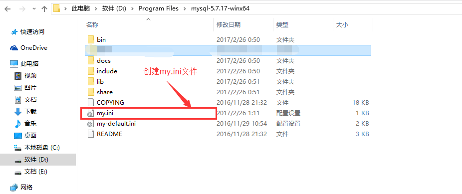 1.mysql-5.7.17-winx64目錄下,新建一個(gè)my.ini。復(fù)制下面的代碼保存就可以了。my.ini會(huì)替換掉下面的my-default.ini文件