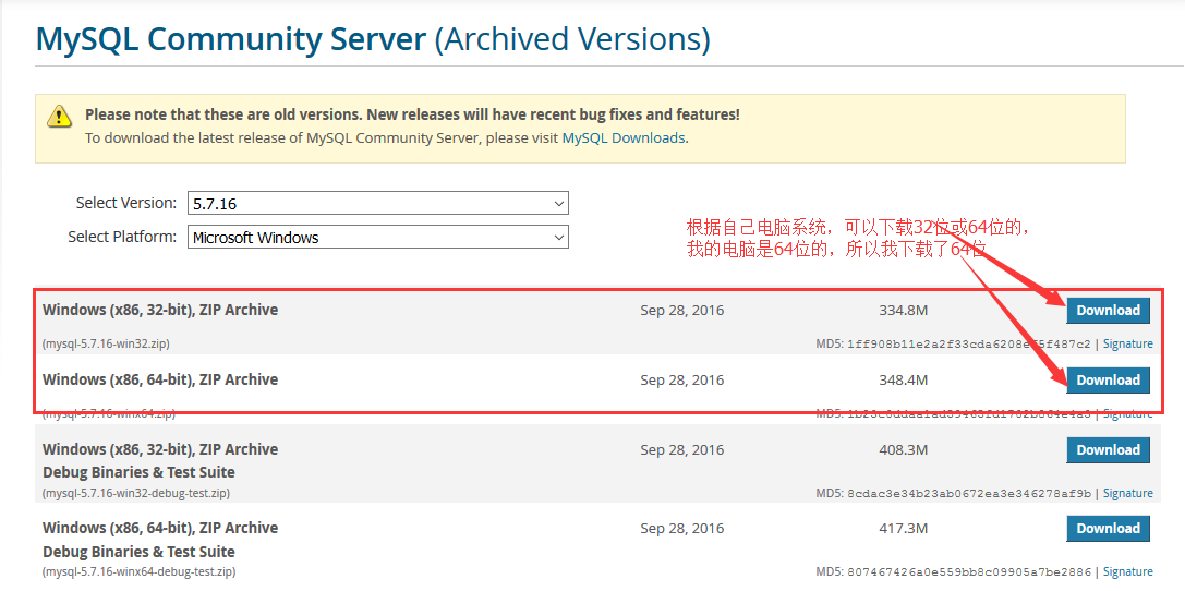 1.mysql官網(wǎng)下載地址:https://downloads.mysql.com/archives/community/
