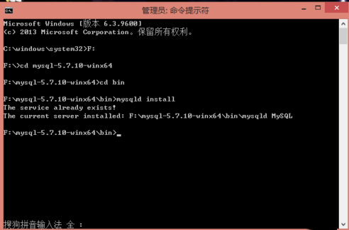 2.以管理員身份打開cmd窗口后,將目錄切換到你的解壓文件bin目錄下。再輸入mysqld install回車運(yùn)行就可以了,注意是mysqld不是mysql。出現(xiàn)安裝成功就可以了。由于我已經(jīng)安裝過了所以就出現(xiàn)這個(gè)了。