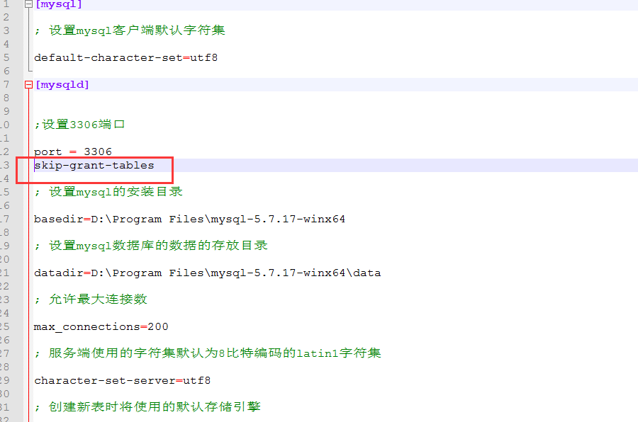 1、my.ini配置文件[mysqld]條目下加一條命令skip-grant-tables,然后重啟mysql