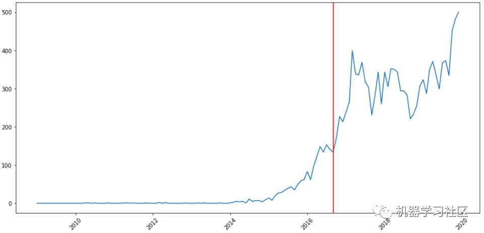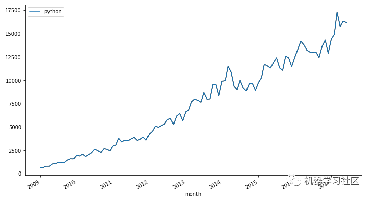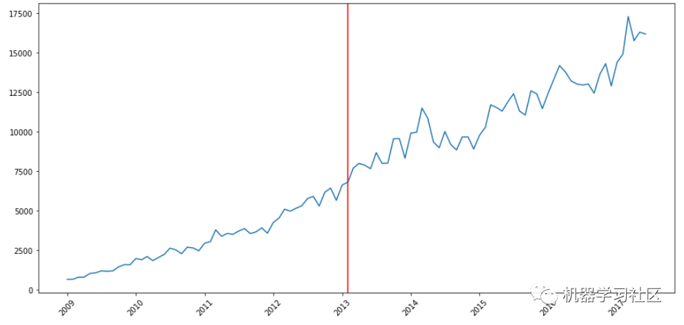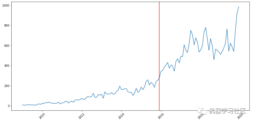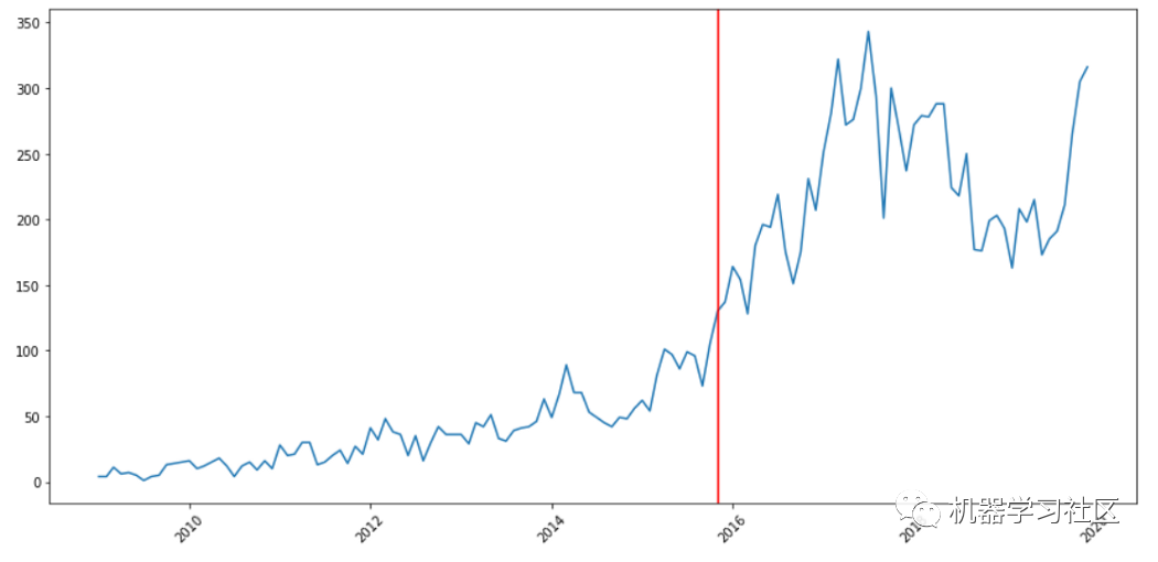 現(xiàn)在讓我們分析一下與 Python 相關(guān)的 StackOverflow 問題計(jì)數(shù)。數(shù)據(jù)被分成一列和一個(gè)測(cè)試集來評(píng)估預(yù)測(cè)。