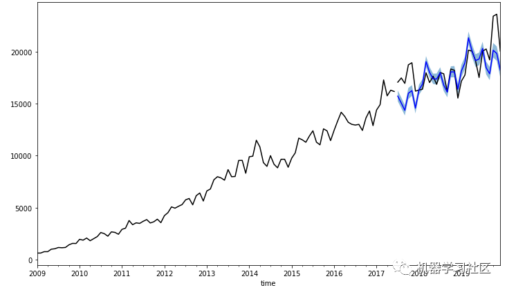 import matplotlib.pyplot as plt fig, ax = plt.subplots(figsize=(12, 7)) train.plot(ax=ax, label="train", color="black") test.plot(ax=ax, color="black") fcst.plot(x="time", y="fcst", ax=ax, color="blue") ax.fill_between(test.index, fcst["fcst_lower"], fcst["fcst_upper"], alpha=0.5) ax.get_legend().remove()