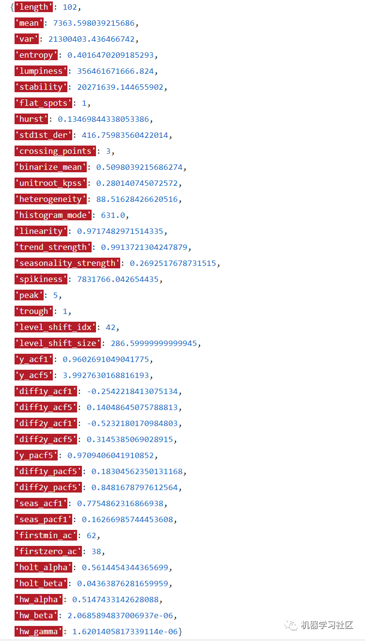 除了統(tǒng)計(jì)數(shù)據(jù)外,時(shí)間序列中還有其他一些特性,如線性、趨勢(shì)強(qiáng)度、季節(jié)性強(qiáng)度、季節(jié)性參數(shù)等,您可能會(huì)感興趣。