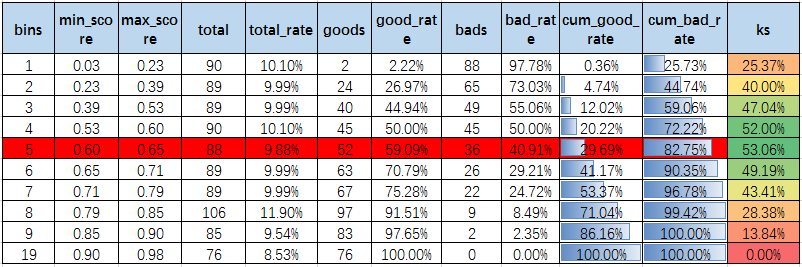 3.如將cutoff限定為0.65,則其cum_bad_rate為82.75%,表示有82.75%的壞客戶會(huì)被拒絕,但同時(shí)cum_good_rate為29.69%,表示同時(shí)會(huì)有29.69%的好客戶會(huì)被拒絕。
